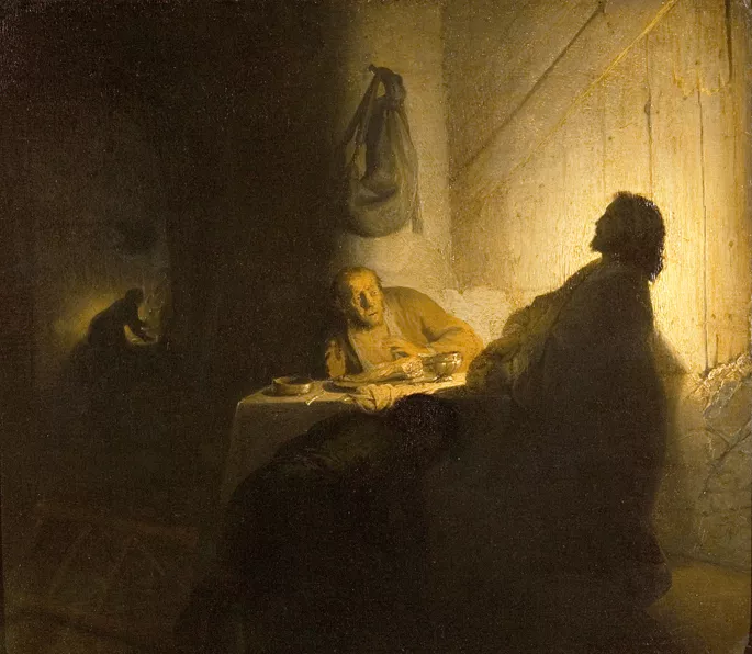 The encounter at Emmaus, evoked by the apostle Luke, was the scene most often depicted by artists. The work is infused with a strong religious sentiment, characterised by its great precision. The guests are sitting at the table, and a servant is busy in the back room: it could almost be an everyday scene from an inn. However, here the scene has been transfigured by using a strong contre-jour effect: the light source is placed behind Christ, turning the figure into an immaterial silhouette. This mysterious light source underlines Christ’s divine nature. Rembrandt represented this supernatural phenomenon by applying an ancient technique—chiaroscuro—, which creates a powerful and dramatic effect.